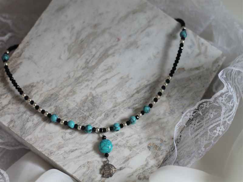 Φέρε το καλοκαίρι πιο κοντά σου με αυτό το χειροποίητο κολιέ με φυσικές τυρκουάζ πέτρες, που θυμίζουν τη θάλασσα και τον ήλιο. Το ατσάλινο στοιχείο σε σχήμα ψαριού προσθέτει παιχνιδιάρικη και δροσερή πινελιά, ιδανική για τις καλοκαιρινές σου εμφανίσεις. Φόρεσέ το μόνο του ή συνδύασέ το με άλλα κολιέ για ένα boho chic layering look.