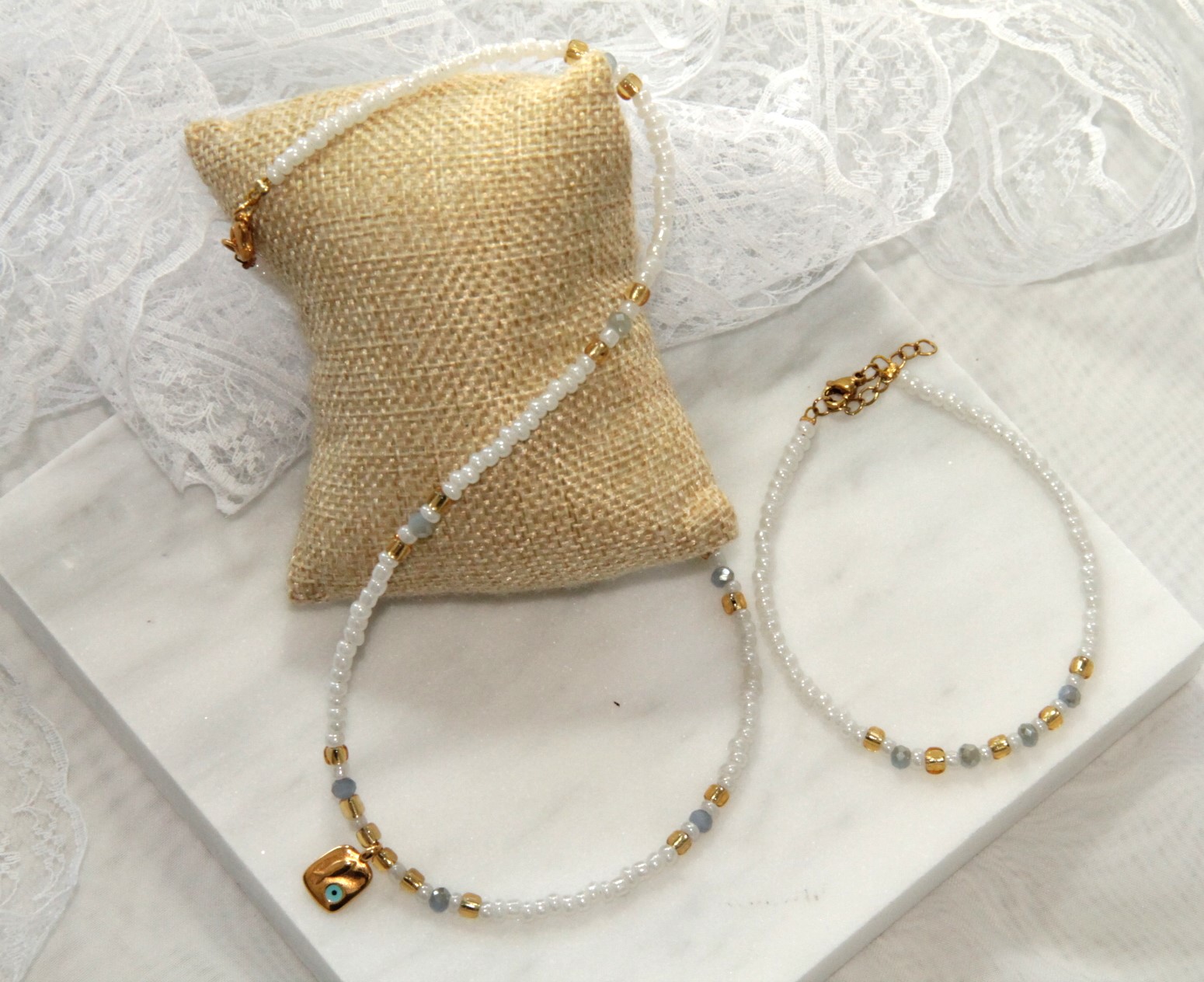 Αυτό το κομψό χειροποίητο σετ περιλαμβάνει ένα διακριτικό κολιέ και ένα βραχιόλι, φτιαγμένα με λευκούς και σιελ ημιπολύτιμους λίθους, διακριτικές χρυσές λεπτομέρειες και ατσάλινα κουμπώματα για ανθεκτικότητα και στιλ. Το επίκεντρο του σετ είναι το επιχρυσωμένο ματάκι . Το βραχιόλι εχει αλυσίδα επέκτασης για εύκολη εφαρμογή. Προστασία, ενέργεια και φινέτσα σε ένα μοναδικό σετ!